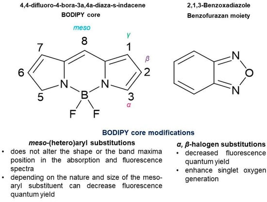 The presented studies describe novel BODIPYs with heterocyclic, benzoxadiazole substituents at the meso position. Photochemical studies and in vitro cytotoxic activity assays towards two human cancer cell lines under normoxic and hypoxic conditions were performed to verify the potential of novel BODIPYs as photosensitizers for anticancer PDT. The chemical scaffolds used in this study and the effect of modifications involving substitution at the meso position and halogenation in the BODIPY structure [32] are presented in Figure 1.