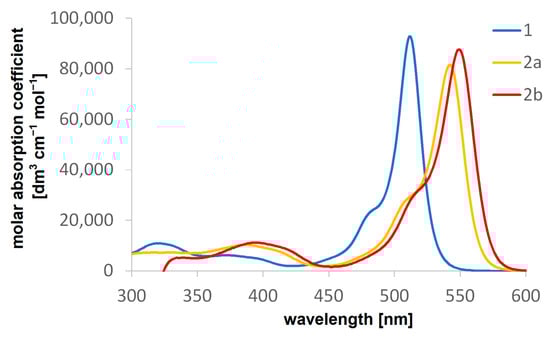 The absorption properties of BODIPYs 1, 2a, and 2b were established in various solvents, including dichloromethane, methanol, ethanol, and dimethyl sulfoxide. Figure 2 presents the UV-Vis absorption spectra of the studied dyes in dichloromethane (DCM), while Figure S13 of Supplementary Information includes the spectra in other solvents.
