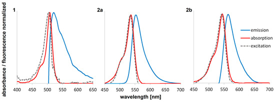 Long-wavelength absorption, excitation, and emission bands for BODIPYs 1, 2a, and 2b in methanol.