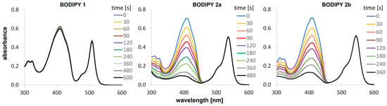 Singlet oxygen quantum yields (ΦΔ) were determined using a relative method, where Rose Bengal was used as a photosensitizer standard and 1,3-diphenylisobenzofuran (DPBF) as a singlet oxygen quencher. The solutions of compounds 1, 2a, 2b, or Rose Bengal with DPBF were prepared in methanol and irradiated with 520 nm green light. During irradiation, DPBF decomposes and oxidizes, which is observed as decreasing absorption at a wavelength of about 410 nm. The changes in the UV-Vis spectra during measurements are shown in Figure 4, whereas first-order plots of DPBF degradation by singlet oxygen are presented in Figure S14 of Supplementary Information. The calculated values of ΦΔ are presented in Table 1. Compound 1 showed a low ability to generate singlet oxygen, with the value of ΦΔ equal to 0.02, compared to the value obtained for the standard substance, Rose Bengal (ΦΔ = 0.76 [40]). On the other hand, derivatives 2a and 2b showed a much higher singlet oxygen generation efficiency with the values of ΦΔ = 0.55 and 0.63. The significantly higher ability to generate singlet oxygen by the compound containing iodine or bromine atoms in positions 2 and 6 of the BODIPY ring is associated with the heavy atom effect. The presence of iodine or bromine atoms at these positions causes the light-excited molecule to transition from the singlet state to the triplet state, where the molecule can react efficiently with molecular oxygen, forming singlet oxygen with high yields [44,49,50].