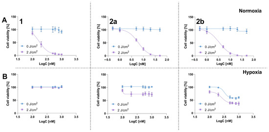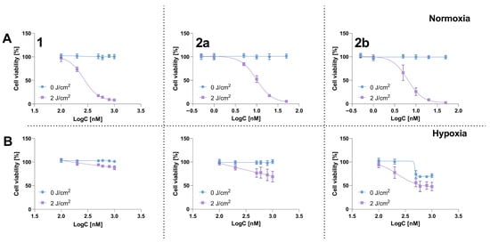 The dose–response curves for compounds 1, 2a, and 2b against MDA-MB-231 cells. Cell viability was measured using the MTT assay 24 h after irradiation (phototoxicity) or without irradiation (dark toxicity) under normoxic (Panel A) and hypoxic (Panel B) conditions. Data are presented as mean values ± SD, calculated from three independent experiments (except for compound 1 under hypoxic conditions, which was repeated once due to its lack of cytotoxic effect).
