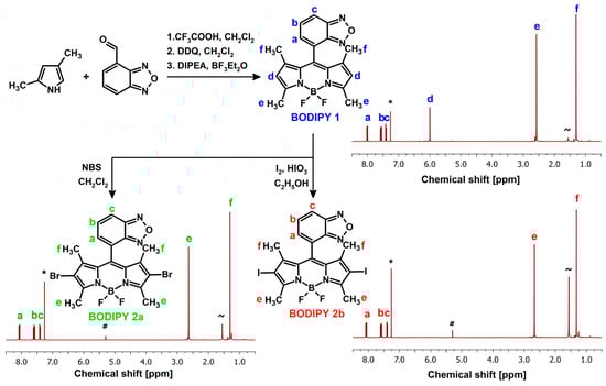 Synthesis of BODIPYs 1, 2a, and 2b with their 1H NMR spectra in CDCl3. The letters a-f assign NMR signals to the hydrogen atoms in the BODIPY structures. The residual peaks of chloroform, dichloromethane, and water are indicated by symbols *, #, and ~, respectively.