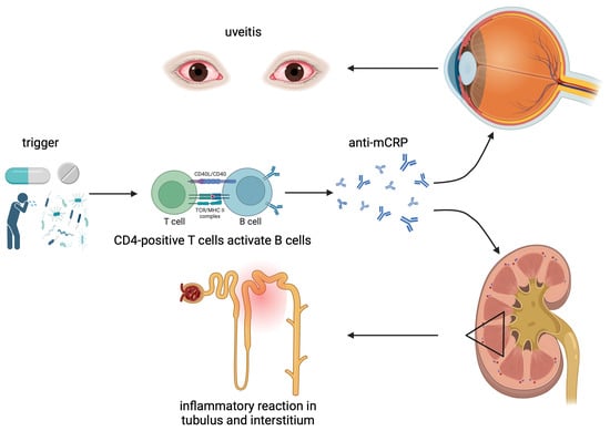 Pathophysiology of TINU syndrome. Drug-related toxicity or infections may trigger an immunological cascade, potentially activating B-cells and leading to the production of antibodies against modified C-reactive protein (anti-mCRP). These antibodies target mCRP proteins in the uvea, renal interstitium, or tubules, resulting in uveitis and acute interstitial nephritis. (Created in BioRender. Bograd, A. (2025) https://BioRender.com/z95m909, accessed on 22 January 2025).