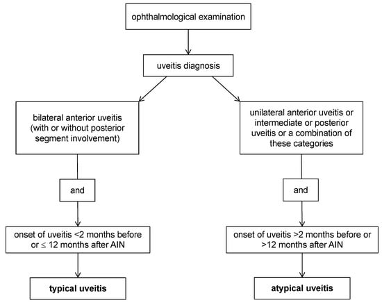 Uveitis in TINU patients is defined as typical or atypical based on clinical presentation and timepoint of onset in relation to AIN (Figure 3) [4,37].