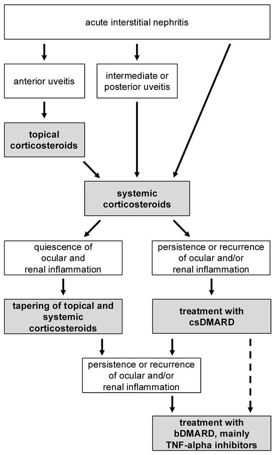In the absence of randomized prospective trials, there are no uniform recommendations for the choice of agent; therefore, general principles for corticosteroid-sparing and immunomodulatory treatment of chronic inflammatory diseases should be followed [16,70]. Nowadays, biologic agents are used more commonly to achieve long-term disease remission [33]. The proposed algorithm, illustrated in Figure 4, outlines a therapeutic approach derived from the prevailing literature and current treatment recommendations for anterior uveitis associated with TINU syndrome. This figure aims to provide clinicians with a clear and practical framework for managing this condition effectively.