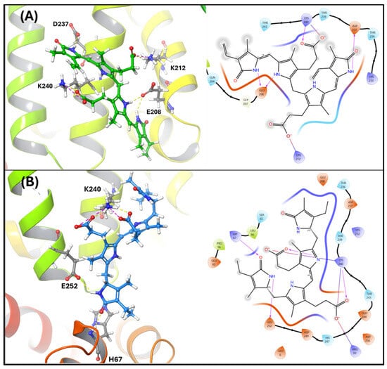 Bilirubin and urobilin interaction with albumin. (A) Bilirubin (green) in the binding pocket of human serum albumin. (B) Urobilin (blue) in the binding pocket of human serum albumin. The left half of the panels shows the 3D orientation, and the right half displays the 2D interaction plot. In the left panels, the yellow lines represent hydrogen bonds, and the purple lines indicate salt bridges.