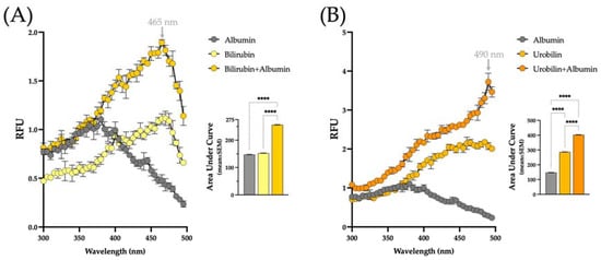 Urobilin and bilirubin present autofluorescence when bound to albumin. (A) Bilirubin (50 μM) binding to albumin (50 μM) excitation spectra with emission at 520 nm. (B) Urobilin (50 μM) binding to albumin (50 μM) excitation spectra with emission at 520 nm. The area under the curve was determined and graphed. **** p < 0.0001, one-way ANOVA. Each point represents three independent replicates and is displayed as mean ± SEM.