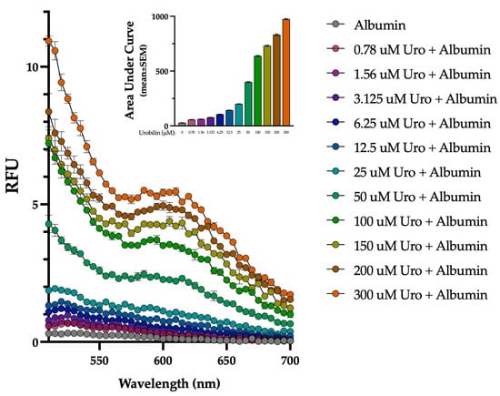 The concentration–response autofluorescence assay was performed as described above in Section 2.4 and as described previously [15,28]. An increasing concentration of urobilin was used from 0.78 to 300 μM. The plate was read over emission spectra from 510 to 700 nm at excitation 490 nm.