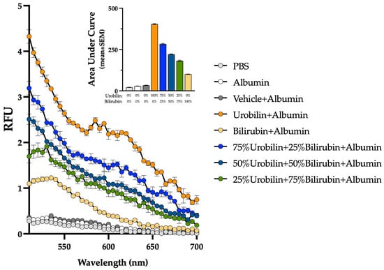 The autofluorescent properties of bilirubin and urobilin were utilized to investigate the binding to albumin in vitro. The autofluorescent property of bilirubin has been well described, whereas bilirubin alone does not fluoresce. Once albumin or another bilirubin-binding protein, such as PPARα, is added, bilirubin autofluorescence increases the fluorescence intensity (RFU) (Figure 3A). The binding was measured over excitation spectra at an emission of 520 nm, which is in line with the previous literature [15,28]. The area under the curve (AUC) was calculated and graphed. Bilirubin + albumin had a significantly higher area compared to albumin and bilirubin alone. The autofluorescence assay was repeated using urobilin instead of bilirubin to determine if it has a similar property and can bind to albumin. Albumin alone had no fluorescence. However, urobilin alone had a marginal background fluorescence. This fluorescence was intensified when urobilin was incubated with albumin (Figure 3B). The AUC was significantly higher in the urobilin + albumin than in the two alone. This indicates that urobilin has a similar autofluorescence property to bilirubin, which fluoresces when bound to protein and urobilin binds albumin. Both bilirubin and urobilin binding to albumin were measured over an excitation spectrum reading at emission wavelength 520 nm. The fluorescent intensity of bilirubin and urobilin peaked at different excitation wavelengths, 465 nm for bilirubin and 490 nm for urobilin, which is consistent with the previous fluorescent studies for bilirubin [15,28] and urobilin [30,31].