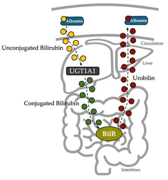 After being produced, bilirubin travels through systemic circulation primarily bound to albumin. Bilirubin is conjugated in the liver by UGT1A1 and transported into the intestines through bile for excretion. Once in the intestines, bacteria species that harbor the bilirubin reductase enzyme remove the conjugation and produce urobilinogen rapidly oxidized to urobilin (Figure 1). The alternation in the chemical structure changes its chemical properties, whereas urobilin is more hydrophilic than bilirubin. Urobilin is then reabsorbed into circulation through the hepatic portal vein. However, it is unknown if urobilin binds albumin to be transported in circulation similar to that of bilirubin.