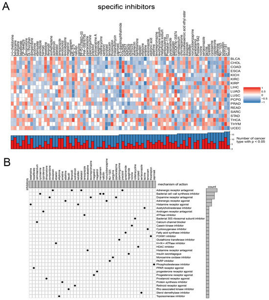 Presents the results from the CMap analysis. (A) illustrates the enrichment profiles of various compounds across tumor samples, highlighting the specific associations between distinct compounds and tumor types. (B) investigates the proposed mechanisms of action for these compounds.