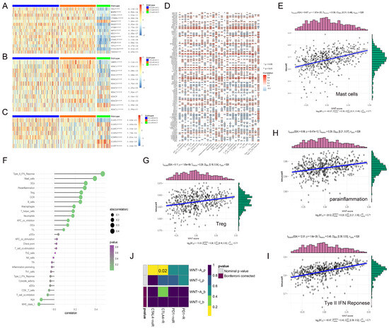 In our study, we examined the correlation between genes in the Wnt-signaling pathway and immune cell infiltration within the tumor microenvironment (TME), which includes tumor cells, immune cells, and various other components, pivotal in cancer progression and immune evasion [36]. In the analysis, we observed that genes such as WNT10A and PLCB2 exhibited strong positive correlations with immune cell infiltration (Figure 5D). Specifically, WNT10A was significantly associated with T cell-related functions, including T cell co-stimulation and TIL, highlighting its potential role in promoting T cell-mediated immunity. Similarly, PLCB2 demonstrated high correlations with T helper cells and immune checkpoint molecules, suggesting its involvement in the modulation of adaptive immune responses. Both genes were positively associated with inflammation-promoting markers and Type I IFN response, while negatively correlated with Mast cells and Type II IFN response, reflecting their distinct but complementary roles in orchestrating the immune landscape of the TME. In contrast, DAAM1 and CTBP2 exhibited significant negative correlations with immune cell infiltration. Notably, elevated Wnt scores were associated with higher levels of immune markers, including mast cells, which are known for their role in releasing histamine and other mediators to regulate inflammation, and Treg cells, a subset of T cells that maintain immune tolerance by suppressing excessive immune responses (Figure 5E,G–I). Conversely, HLA, a critical component of the major histocompatibility complex that presents antigens to T cells for immune recognition, showed a negative correlation with Wnt scores (Figure 5F).
