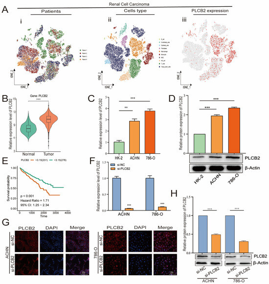 PLCB2 expression analysis. (A) Clustering, annotation, and expression of the PLCB2 gene in all RCC samples from the scRNA-seq dataset GSE152938. (B) Examination of PLCB2 mRNA levels in KIRC samples sourced from the TCGA database. (C,D) Demonstration of the use of qRT-PCR and Western blot to analyze PLCB2 mRNA and protein levels in normal kidney tissue and renal cancer cell lines. (E) Presentation of a survival analysis that correlates PLCB2 expression levels with patient outcomes in KIRC. (F–H) qRT-PCR, immunofluorescence, and Western blot analyses of mRNA and protein expression levels of si-NC and si-PLCB2 in RCC lines. ** p < 0.01, *** p < 0.001.