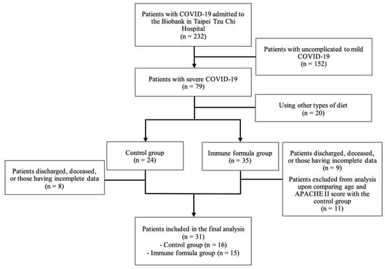 Among the 232 patients in the biobank enrolled in this study, 152 with mild-to-moderate COVID-19 were excluded, leaving 79 patients with severe COVID-19 for recruitment. After excluding 20 patients who used alternative diets, the remaining patients were divided into the control and immune formula groups according to their diet. During the study period, 17 patients were discharged or died. After matching for age, sex, height, weight, and APACHE II score to best match those of the control group, 11 patients from the immune formula group were excluded. Thirty-one patients (16 in the control group and 15 in the immune formula group) with complete data were included in the final analysis (Figure 1).