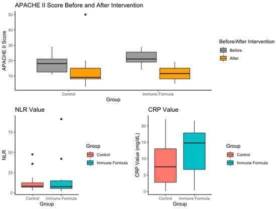 This study aimed to assess the effects of an immune-enhancing formula compared with a standard formula in patients with severe COVID-19. Our findings revealed that although patients receiving the immune-enhancing formula had a higher APACHE II score, their APACHE II score was reduced to a level similar to the control group after the intervention, indicating a significant improvement in clinical symptoms. The body weight of the intervention group was also significantly higher after the intervention. We speculate that the lower body weight of the intervention group at admission may be correlated with the period of malnutrition of critical patients prior to admission to the ICU []. The significant increase in body weight is likely to result from adequate nutrition. Additionally, upon ICU admission, patients who were administered the immune-enhancing formula showed significantly higher IL-10 levels. The neutrophil-to-lymphocyte ratio (NLR) reflects the immune response during infection and is the major predictor of mortality in COVID-19 patients [,]. This was not significantly different between groups, signifying that the two groups had similar immune response conditions, although the lack of difference was largely attributed to the great variance within the group. Nonetheless, the NLR value was elevated in the two groups. The CRP values of all the ICU-admitted patients were slightly elevated.