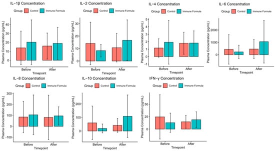 When analyzing the intra-group differences, a significant increase was observed in IL-4 within the control group before and after intervention (Figure 3, Supplementary Table S3; 1.15 ± 1.24 vs. 1.79 ± 1.48 pg/mL, p = 0.038). Conversely, the IL-6 and IL-10 levels in the immune formula group (Figure 3, Supplementary Table S3) exhibited a significant increase after intervention (IL-6: 228.75 ± 539.99 vs. 1058.33 ± 1725.60 pg/mL; IL-10: 18.99 ± 32.89 vs. 108.76 ± 157.03 pg/mL; p = 0.033 and p = 0.014, respectively). However, there were no changes for IL-1β, IL-2, IL-8, and IFN-γ in either group.