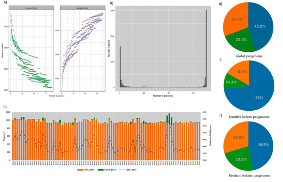 Figure 1. The pan-genome of the 88 Mtb isolates from Ecuador. (A) Rarefaction curves of the core genome (green) and the pangenome (light purple). (B) Cluster frequency in the core genome. Each bar represents the core genome composition of an individual isolate, with the global core genome depicted by the final bar after analysis by Roary for all isolates. (C) Distribution of accessory, cloud, and total genes across all isolates analyzed in this study, highlighting the variability in pangenome components among different strains. (D) Global pangenome composition, where the core genome constitutes almost half of the total gene content. (E) Pangenome composition for sensitive isolates, with the core genome comprising nearly 75% of all genes. (F) Pangenome composition for resistant isolates, where the accessory genes increase, potentially reflecting specific characteristics associated with resistance. Colors in pies: core gene (blue), accessory gene (orange), and cloud gene (green). The dotted line in panel C represents the total genes of each isolate.