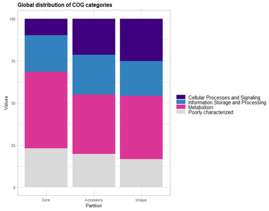 A functional analysis among different pangenome partitions based on COG categories globally showed that genes associated with metabolism (45.45% in the core genes to 35.27% in the accessory genes), as well as genes related to cellular processes and signaling (24.97% in the unique gene to 9.79% in the core genes), present significant global variations. Additionally, we determined that genes with general function predictions [R] (over 10% in all partitions) are the most recurrent, followed by genes associated with secondary metabolites biosynthesis, transport, and catabolism [Q] (10% in accessory and unique genes). Finally, genes associated with cell motility [N] were predominantly in the accessory gene category.