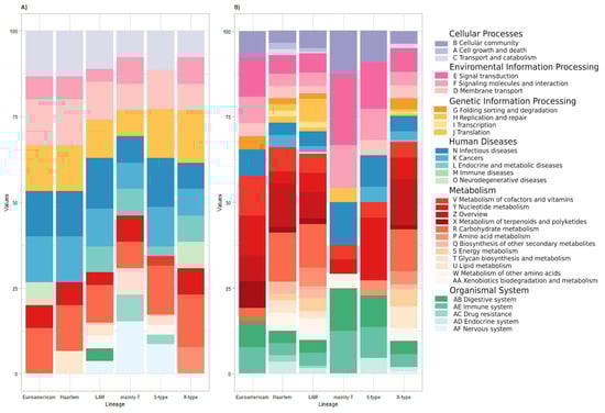 Figure 5. Distribution of primary KEGG pathways. (A) The percentage of functional annotations among the genes highly conserved among the unique genes from all lineages analyzed; (B) the percentage of functional annotations among the genes highly conserved among the accessory genes from all lineages analyzed in this study. Alphabetical labels correspond to standard KEGG pathway categories, with full names included to ensure clarity and consistency with KEGG conventions, facilitating the interpretation of genes according to their biological roles.