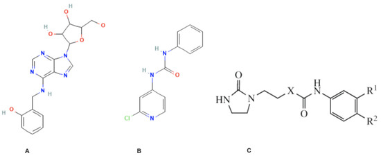 Forchlorfenuron (CPPU, Figure 1) is a synthetic chlorinated cytokinin analog [11]. It inhibits proliferation, migration, and invasion in cells of various types of oncological diseases, such as tumors of the prostate, lung, colon, breast, ovary, and cervix and mesothelioma. CPPU has been found to inhibit tumor growth in mouse trials [15]. Forchlorfenuron derivatives with oxygen- and sulfur-containing groups at significantly lower doses (4–33 μM versus 100 μM for CPPU) were found to inhibit the proliferation of cancer cells in several endometrial and ovarian cell lines [11].