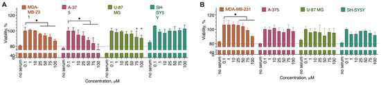 First, we tested the synthesized compounds for their ability to induce cell death or decrease proliferation in a set of cancer cell lines. We used human cell lines of three major cancer types (glioblastoma U-87 MG, melanoma A-375, and metastatic breast cancer MDA-MB-231) and a neuroblastoma SH-SY5Y cell line in an acute 24-incubation setting. The cell lines were chosen to represent the major clinically significant cancer types. For the preliminary evaluation, the 24 h incubation time was chosen as it is typically enough for the compounds to modulate cell proliferation. However, in the case of the anti- or pro-proliferative action, a longer incubation period is typically required to reliably detect small changes in cell viability. Thus, in the case of substantial activity, additional experiments were carried out to evaluate the activity of the compounds after 72 h of incubation to obtain more details on the effects on cell proliferation. The compounds were assayed in the concentration range of 1–100 µM to account for the lowest potential load for the patient’s organism.