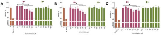 The anti-proliferative effect of the most active compound, 6, on the MDA-MB-231 (A), A-375 (B), and U-87 MG (C) cells during long-term incubation (72 h). Negative control cells (100% viability) were treated with 0.5% DMSO. Positive control cells (0% cell proliferation) were incubated in the cell culture medium without serum. Resazurin test data, amalgamated data of N = 3 experiments, mean ± standard error. *, a statistically significant difference from the control without the substance, p < 0.05 in ANOVA with the Tukey post-test.