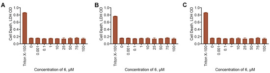 Cell death induction by compound 6 for the MDA-MB-231 (A), A-375 (B), and U-87 MG (C) cell line. Negative control cells (100% viability) were treated with 0.5% DMSO. Positive control cells (100% cell death) were treated with 3.6 μL of 50% Triton X-100 in ethanol per 200 μL of the cell culture medium. LDH test data, 72 h incubation time. Amalgamated data of N = 3 experiments.