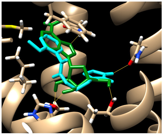 Molecular docking results for adenosine (green) and compound 6 (cyan) in the active site of the activated A2AR receptor. Red, oxygen; white, hydrogen; blue, nitrogen. AutoDock Vina data; hydrogen bonds are shown in yellow.