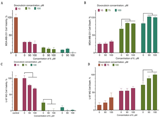 The effect of compound 6 on doxorubicin activity for the MDA-MB-231 (A,B) and U-87 MG (C,D) cell lines. Negative control cells (100% viability) were treated with 0.5% DMSO. Positive control cells (100% cell death) were treated with 3.6 μL of 50% Triton X-100 in ethanol per 200 μL of the cell culture medium. Note: 72 h incubation time, resazurin (A,C) and LDH (B,D) test data, mean ± standard error (N = 3 amalgamated experiments), p ≤ 0.05.