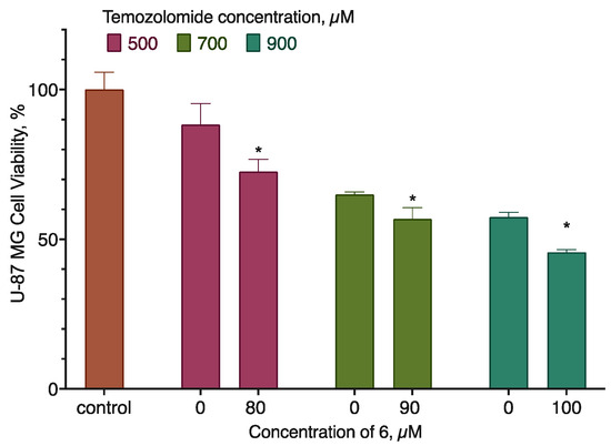 The effect of compound 6 on temozolomide activity for the U-87 MG cell line. Negative control cells (100% viability) were treated with 0.5% DMSO. Positive control cells (100% cell death) were treated with 3.6 μL of 50% Triton X-100 in ethanol per 200 μL of the cell culture medium. Note: 72 h incubation time, resazurin test data, mean ± standard error (N = 3 amalgamated experiments) * Statistically significant difference from the control without the substance in the ANOVA with the Dunnett’s post-test, p ≤ 0.05.