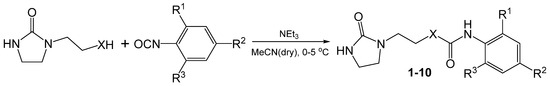 The general procedure of aryl carbamate (2,4,6,9,10) synthesis according to ref. [6,13] was as follows: In a round bottom flask equipped with a calcium chloride tube and magnetic stirrer, 6.55 mmol of 1-(2-hydroxyethyl)-2-imidazolidinon in a small volume of dry acetonitrile, solution of 6.58 mmol of the relevant phenyl isocyanate in dry acetonitrile (total volume 50 mL), and 2–3 drops of triethylamine were stirred overnight. The reaction mixture was evaporated to dryness, and the residue was recrystallized from methanol and isopropanol. The precipitate was filtered off and purified through crystallization from a suitable solvent or using column chromatography.