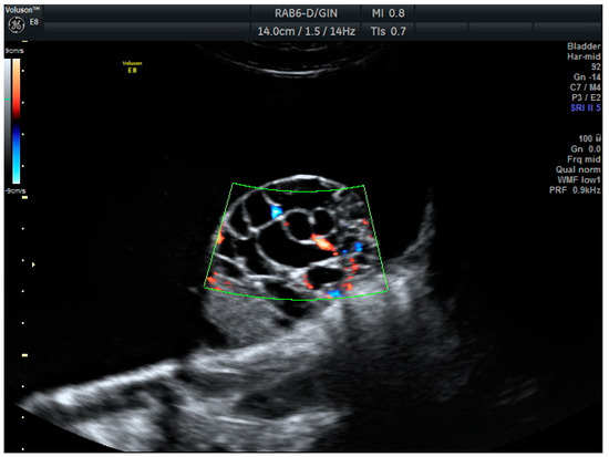 The features evaluated included the largest tumor diameter (mm), tumor contours (regular or irregular), the presence of acoustic shadows, the presence and size of a solid component, the presence and number of papillary projections (including their dimensions), the presence of septa, the number of locules and ascites, and the Doppler color score (graded 1 to 4) in solid areas, septa, and papillae.
