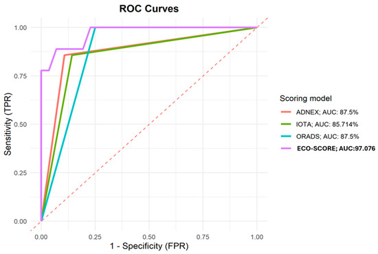 Using ECO-SCORE, we obtained an overall sensitivity of 92.98 (83–98.1), similar to the previous scores (ADNEX model 90–96, IOTA-SR 93–95, and O-RADS 90.2) [