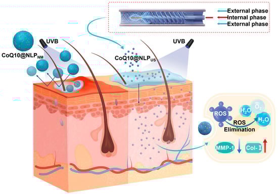 In our previous report, we introduced an HBSCF device, which can produce nanoliposomes with a particle size of 80 nm and a low polydispersity index (PDI) []. Nevertheless, the utility of the HBSCF device for the production of NLPUS yet remains to be elucidated. In this work, we optimized the synthesis parameters, such as total flow rate (TFR, the sum of the internal and external phase flow rates) and flow rate ratio (FRR, external phase: internal phase), to produce lecithin-based nanoliposomes with particle sizes below 40 nm with an excellent homogeneity (PDI < 0.2), while obviating the use of the synthetic surfactants. The ability of NLPUS to load a variety of anti-aging agents, including coenzyme Q10 (CoQ10), without altering their particle size or homogeneity demonstrates the versatility of this system as a drug carrier (Figure 1). Furthermore, the unsaturated lipid nature of lecithin may endow the nanoliposomes with an ability to efficiently scavenge reactive oxygen species (ROS), thereby rendering them an effective transdermal drug delivery system for skin photoaging models []. In vitro transdermal experiments demonstrated that our NLPUS could deliver drugs more efficiently to the basal layer of the skin as compared to the conventional liposomes with a larger size (>200 nm, NLPNM). To verify the potential of the CoQ10-loaded NLPUS (CoQ10@NLPUS) to repair photoaged skin, we used a mouse model of photoaging; the latter closely recapitulates the pathophysiological characteristics of aged human skin. The HBSCF device may offer a promising platform for the production of homogeneous NLPUS for enhanced transdermal drug delivery, which may also have broad implications for liposomal drug delivery for skin regeneration and potentially other related disciplines.