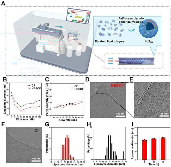 Nanoliposomes were synthesized with HBSCF and normal co-flow focusing (CF) devices, separately. Both of the above devices have dimensions similar to the previously reported devices and were fabricated using a projection microstereolithography-based 3D printing method provided by BMF Precision Tech Inc. (BMF, Shenzhen, China) []. For liposome synthesis, poly (ethylene glycol) (PEG, Mw = 400 Da) was dissolved in PBS (0.01 mol/L, pH = 7.4) at a concentration of 15 mg/mL, which served as an external phase solution. The lipid solution was used as an internal phase solution. These solutions were simultaneously injected into the microfluidic device (either CF or HBSCF device) with a precision syringe pump for internal phase solution and an advection pump for the external phase solution. It is worth noting that all experiments were performed at an ambient temperature, ~25 °C, as a lower temperature can lead to the precipitation of the components before liposome formation. The particle size of liposomes was measured by a Dynamic Light Scattering (DLS) particle size analyzer (Malvern, Worcestershire, UK) at 25 °C. The samples stored in a refrigerator at 4 °C were brought to room temperature before analysis. Morphology of liposomes was investigated by cryo-transmission electron microscopy (Thermo Fisher Scientific, Waltham, MA, USA).
