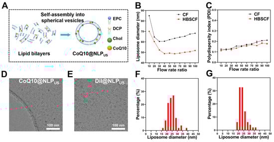 Characterization of NLPUS as a drug carrier. (A) Schematic illustration of drug-loaded nanoliposomes. (B) DLS particle size of the nanoliposomes containing CoQ10 obtained at different FRRs and a fixed TFR of 80 mL/min. (C) PDI values of the nanoliposomes containing CoQ10 obtained at different FRRs and a fixed TFR of 80 mL/min. (D) Cryo-TEM image of CoQ10@NLPUS prepared with an HBSCF device at a fixed TFR value of 80 mL/min and am FRR value of 40 (scale bar = 100 nm). (E) Cryo-TEM image of DiI@NLPUS prepared with an HBSCF device at a fixed TFR value of 80 mL/min and an FRR value of 40 (scale bar = 100 nm). (F) Distribution of the particle size of the CoQ10@NLPUS. (G) Distribution of the particle size of the DiI@NLPUS. The values are represented as the mean ± SEM.