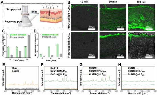 Transdermal characterization of NLPUS. (A) Schematic illustration of the transdermal experiment. (B) Skin slices after transdermal experiments using FITC@NLPUS and FITC@NLPNM (scale bar = 300 μm). (C) Fluorescence measurements of the stratum corneum and stratum basal in the FITC@NLPUS group of slices. (D) Fluorescence measurements of the stratum corneum and stratum basal in the FITC@NLPNM group of slices. (E) Raman spectra of skin and CoQ10. (F) Raman spectra of the skin surface after performing transdermal experiments. (G) Raman spectra at 20 µm below the skin surface after performing transdermal experiments. (H) Raman spectra at 60 µm below the skin surface after performing transdermal experiments. The value is represented as the mean ± SEM.