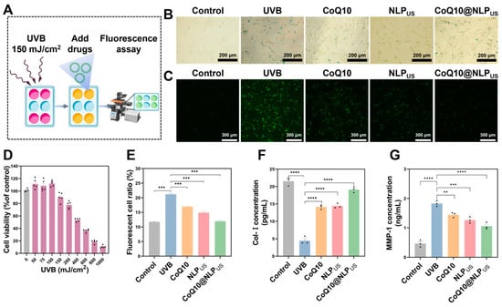 We next deciphered the effect of CoQ10@NLPUS on UVB-induced photoaged cells (see Figure 5A for the experimental procedure illustrating the cellular photoaging with UVB). NLPUS, CoQ10, and CoQ10@NLPUS mitigated UVB-induced photoaging of HSFs (Figure 5B). While the number of β-gal+ senescent cells (stained in green) decreased in all groups, CoQ10@NLPUS outperformed other groups and exhibited the lowest number of β-gal+ senescent cells, thereby indicating its beneficial effect in alleviating UVB-mediated cell photoaging. It has been previously reported that sustained exposure to UVB induces ROS in cells, which triggers cellular photoaging [,]. To investigate the mechanism by which CoQ10@NLPUS can alleviate cellular photoaging, we evaluated ROS levels in the photoaged cells treated with blank NLPUS, CoQ10, and CoQ10@NLPUS with fluorescent staining and flow cytometry (Figure 5C,E and Figure S11). ROS levels were significantly increased in the HSFs with UVB irradiation; CoQ10@NLPUS exhibited a significantly higher ROS scavenging ability than that of CoQ10, and manifested ROS levels similar to unirradiated cells. The ROS scavenging ability of CoQ10@NLPUS can be ascribed to higher cellular uptake of CoQ10. NLPUS also exhibited an excellent ROS scavenging ability partly due to the EPC; the latter is an unsaturated phospholipid and is the main constituent of NLPUS, and can scavenge intracellular ROS. Consequently, CoQ10 and NLPUS can show a combined effect to scavenge ROS. These data showed that UVB-induced cellular photoaging can be efficiently alleviated by CoQ10@NLPUS, which is suggestive of its ability to restore redox homeostasis in HSFs.