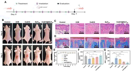 A skin photoaging model was established using a UVB lamp (Philips,  Eindhoven, The Netherland). Different types of samples (PBS, CoQ10, NLPUS, and CoQ10@NLPUS) with Aquaphor (Eucerin) were evenly spread on the backs of nude mice (female, 6 weeks old); the latter were placed in a dark environment for 2 h before UVB irradiation at an intensity of 300 mJ/cm2, a process that was continued for up to 7 days. Nude mice were randomly divided into 5 groups (n = 4): (i) no UVB irradiation, PBS cream (per day × 7 days), (ii) UVB irradiation, PBS cream (per day × 7 days), (iii) UVB irradiation, CoQ10 cream (per day × 7 days), (iv) UVB irradiation (per day × 7 days), NLPUS cream, and (v) UVB irradiation, CoQ10@NLPUS cream (per day × 7 days).
