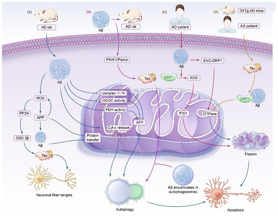 Deposition of Aβ also leads to mitochondrial dysfunction, inducing oxidative stress and further damage to neurons, acting in a vicious circle. Specifically, the accumulation of Aβ in synaptic mitochondria decreases the expression of mitochondrial complexes III and IV as well as the activities of cytochrome oxidase, α-ketoglutarate dehydrogenase, and pyruvate dehydrogenase, resulting in mitochondrial respiratory dysfunction, oxidative stress, and a reduction in energy metabolism in brain neurons, which is an early pathological manifestation of AD [45]. In addition, it has been shown that mitochondria in the brains of postmortem AD patients contain Aβ and that free radicals are increased in the brains of AD patients, further confirming the link between Aβ and oxidative stress. Additionally, Faizi et al. found that Aβ peptide treatment destroyed matrix metalloproteinases in brain neurons and promoted the formation of ROS in brain mitochondria. Compared with untreated rats, elevated ROS, mitochondrial membrane depolarization, mitochondrial swelling, Cyt-c release, and significantly increased ATP/ADP ratios were observed in rat brain mitochondria isolated from the Aβ peptide treatment group at different stages, which eventually led to caspase-3 activation, thereby mediating rat brain neuronal apoptosis [46]. Aβ may also be involved in the pathogenesis of AD by inhibiting mitochondrial axonal transport [45].