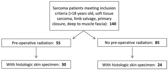 Selection criteria for study cohort. An initial cohort of 140 patients with soft tissue sarcoma met the inclusion criteria. Of these individuals, 55 received preoperative radiation therapy and were selected as the exposure group. The remaining 85 individuals were selected as comparison subjects. Pathology reports were reviewed to identify patients with archived formalin-fixed paraffin-embedded skin specimens available for analysis. Patients were excluded if their surgical specimens did not include full-thickness skin, or if the archived tissue was exhausted or was not available. The final cohort included 54 patients (31 with preoperative radiation therapy and 24 without).