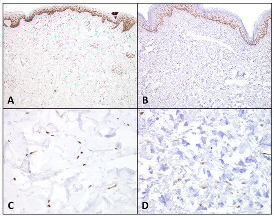 The decreased hair follicles and sebaceous glands in the skin of irradiated patients in this study are consistent with previous descriptions of irradiated skin and radiation dermatitis []. Keratinocytes from the pilosebaceous units, along with eccrine glands, contribute to re-epithelialization in skin wounds [,], but their decrease in the irradiated patients of this study did not translate to an association with more WHCs. This may suggest that factors other than a reduced capacity for re-epithelialization play a significant role in WHCs.