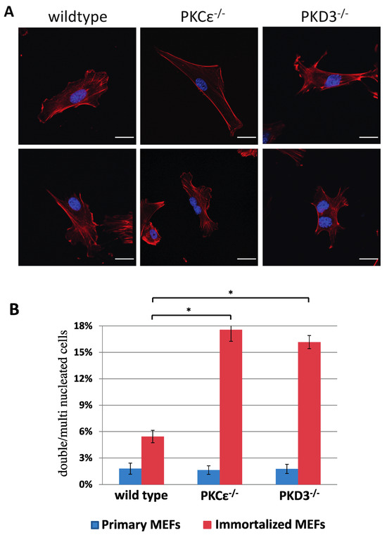 Double/multi-nucleation in immortalized PKCε- and PKD3-deficient MEFs. (A) MEFs of the indicated genotypes were fixed with 4% PFA and stained with phalloidin and DAPI. The top row shows representative images of primary MEFs (passage number 2–4), and the second row shows representative images of MEFs after immortalisation (>10 passages). The experimental details are described in Section 2. Scale bar, 24 μm. (B) The graph shows a calculation of single-nucleated versus double/multi-nucleated MEFs of various genotypes and compares primary with immortalized cells. The genotypes are indicated below, the primary values are shown in blue, the immortalized values are shown in red and the error bars represent the standard deviation; * indicates p-values 0.000072 for wt/PKCε-/- and 0.000028 for wt/PKD3-/- by t-test.