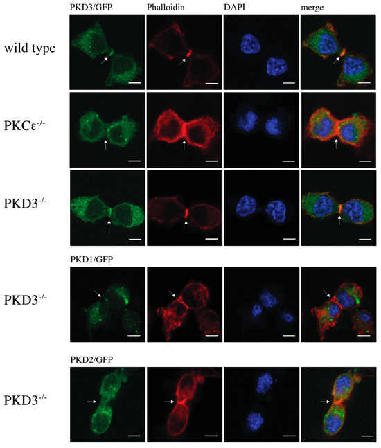 Localisation of protein kinase D during cytokinesis: The top row shows wild-type MEFs expressing PKD3/GFP, the 2nd row shows PKCε-/- MEFs expressing PKD3/GFP, the 3rd row shows PKD3-/- MEFs expressing PKD3/GFP, and the 4th and 5th rows show PKD3-/- MEFs expressing either PKD1/GFP or PKD2/GFP as indicated. All MEFs were fixed with 4% PFA and stained with phalloidin and DAPI. All experimental details are described in Section 2. Representative images of MEFs during cytokinesis are indicated by the presence of the cleavage furrow. The arrows indicate the position of the cleavage furrow, and the expression of the exogenous proteins is shown in Supplementary Figure S2; scale bar, 48 μm.