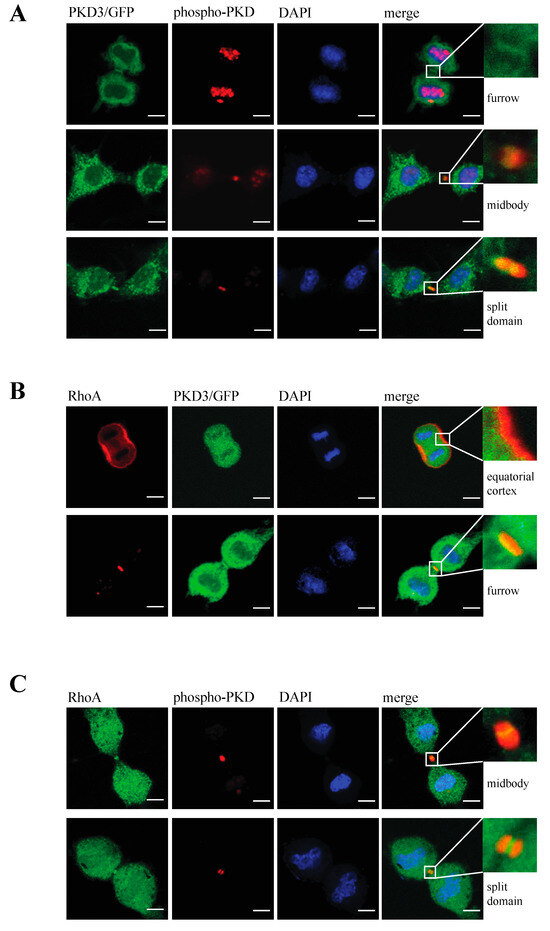 Taken together, our study provides the first evidence that PKD3 is functionally involved in cytokinesis regulation and defines PKD3 as a downstream kinase of PKCε-mediated signalling to RhoA in this context. Our initial observation is limited to immortalised MEFs, which raises the question of how relevant this phenotype is to a wild-type cell. However, we believe that it is relevant in the context of tumourigenesis, which ultimately results from immortalisation. The extent to which GFP and similar overexpressed constructs reflect the in vivo function of individual proteins can only be verified by alternative experiments using other tools, if available. Further future experiments aiming to identify the corresponding PKD3 substrates could consist of a combination of pull-down experiments followed by proteomic analysis (as performed, for example, by Capalbo et al. [28]). Certainly, future identification of interacting proteins and/or substrates will help to further elucidate the mechanistic role of PKD3 during cytokinesis that we have identified.