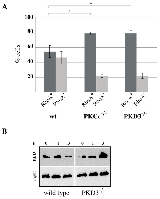 RhoA activity is altered in PKCε- and PKD3-deficient MEFs: (A) RhoA+ cells were analyzed during cytokinesis. The y-axis indicates percentage of cells, dark gray represents RhoA+ cells, light gray represents RhoA− cells, the corresponding genotypes are indicated below and the error bars represent the standard deviation; * indicates p-values of 0.00383 for RhoA+ cells in wt/PKCε-/- and 0.00471 in wt/PKD3-/- by t-test. (B) Wild-type and PKD3-deficient MEFs were assessed for RhoA activity using an activated RhoA pull down following nocodazole treatment (0, 1 and 3 h).