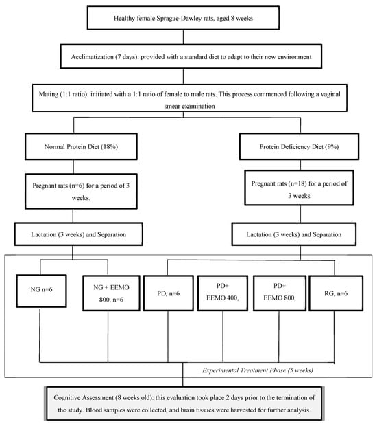 Diagram of the experimental procedure, animal grouping, and timeline of treatment. (NG: normal group; NG+EEMO 800: normal group plus EEMO 800 mg; PD: protein deficiency; PD+EEMO 400 mg: protein deficiency plus EEMO 400 mg; PD+EEMO 800 mg: protein deficiency plus EEMO 800 mg; RG: recovery group).
