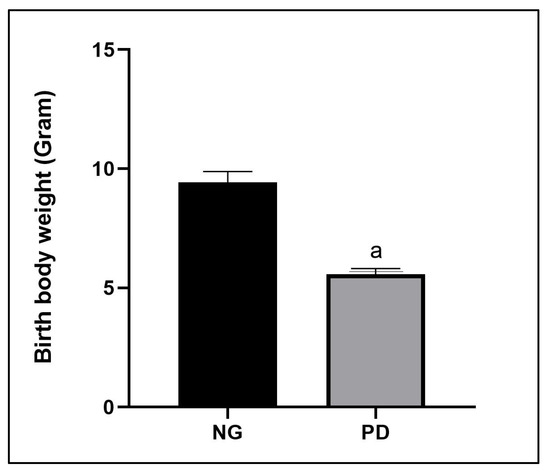 Comparison of birth body weight (gram) of pups from mother with normal diet vs. protein deficiency. a p < 0.001 vs. NG. NG = normal group; PD = protein deficiency.
