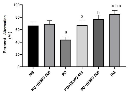Treatment with EEMO 400 mg and 800 mg or RG significantly improved cognitive functioning, as demonstrated by a larger percentage of change in the Y-maze test, compared to the PD group, which had the lowest cognitive scores (p < 0.05) (Figure 5).