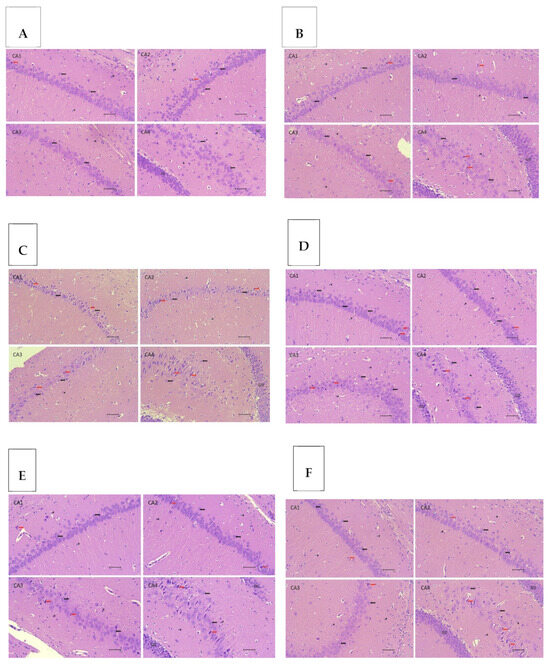Histopathological depiction of the hippocampal cornu ammonis (CA) area with HE staining at 400× magnification. (A) Normal group (NG); (B) NG+EEMO 800 mg; (C) protein deficiency (PD); (D) PD+EEMO 400 mg; (E) PD+EEMO 800 mg; (F) recovery group (RG). Black arrows indicate normal pyramidal neurons; red arrows indicate degenerated pyramidal neurons; star symbols indicate glial cells; GD indicates the gyrus dentate region; the scale on the image is 20 µm.